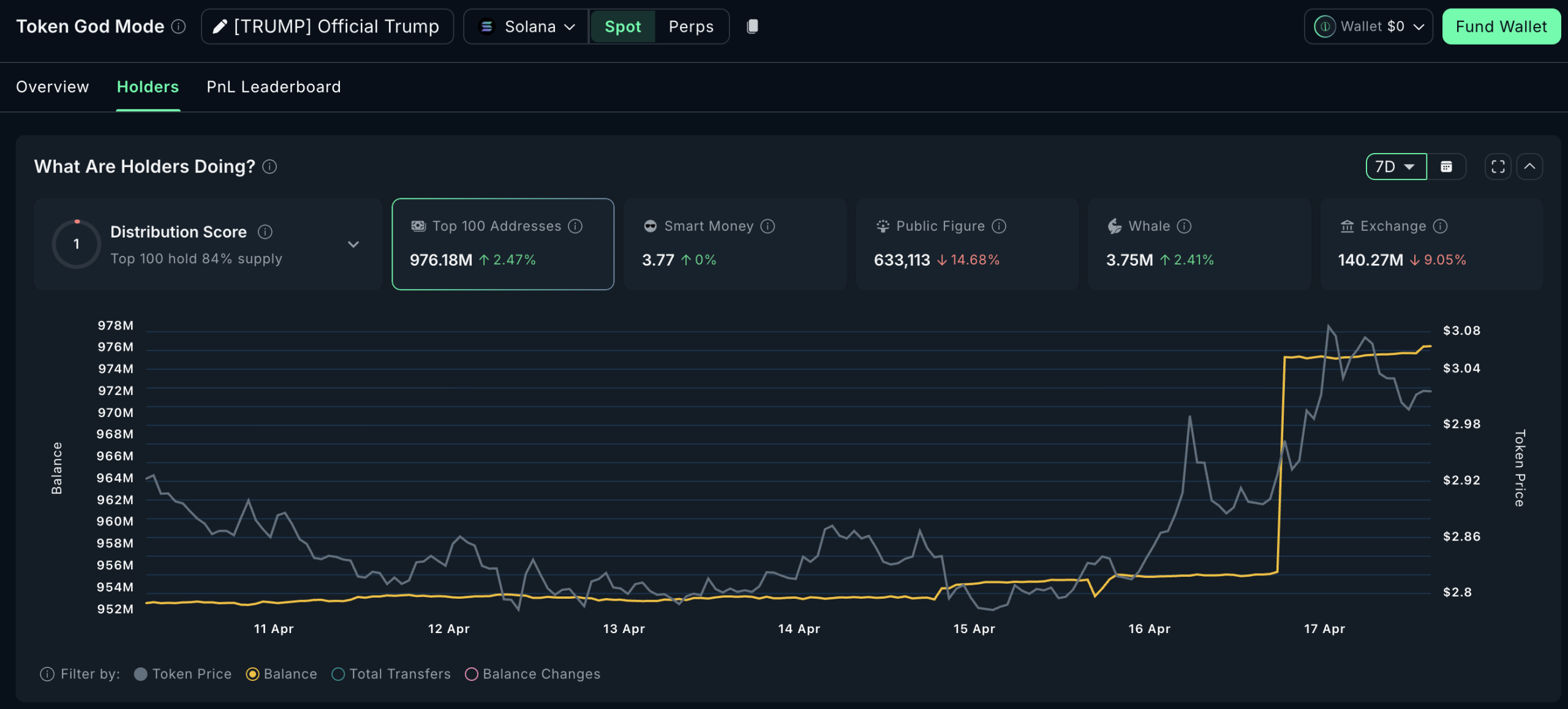 On the price chart, TRUMP has consolidated between $2.77 and $3.11 since late March. The $2.77 support has held on multiple tests. It now forms a cup base with a potential double-bottom inside it. Volume has quietly expanded on the green candles since March 23, a divergence typically seen before accumulation-led recoveries.