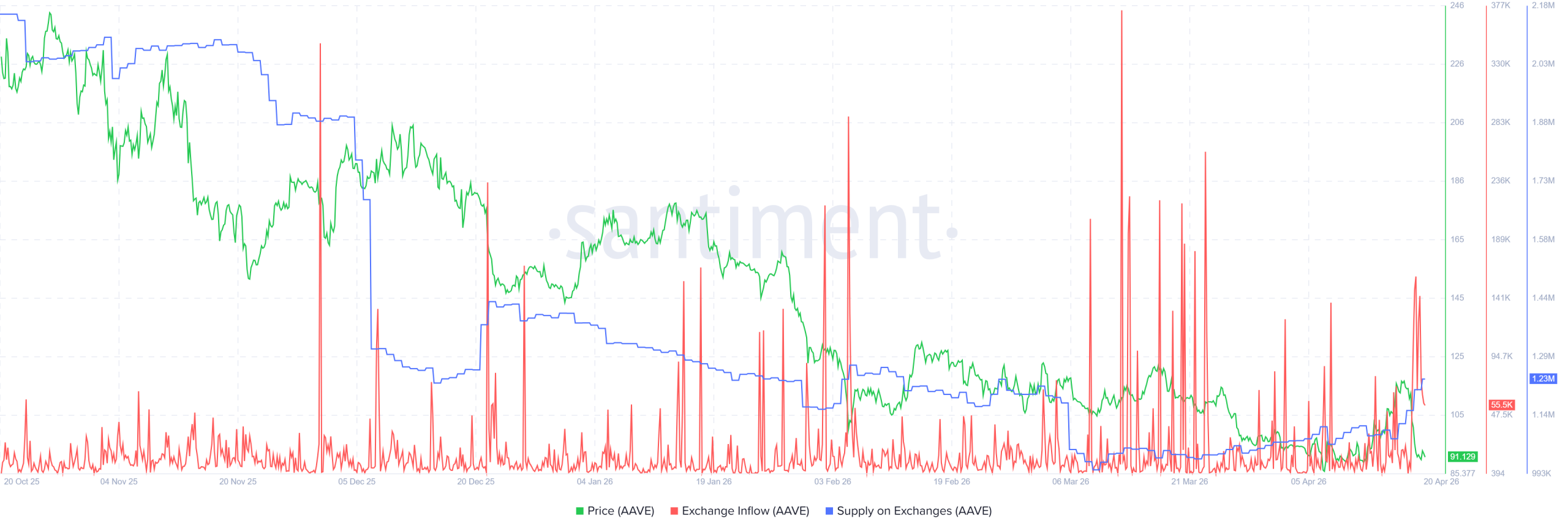 Santiment data shows AAVE exchange inflows spiked over the past two days. The reading marks the largest inflow cluster since March 2026. It lined up closely with the recent sell-off from $112 back toward $90.