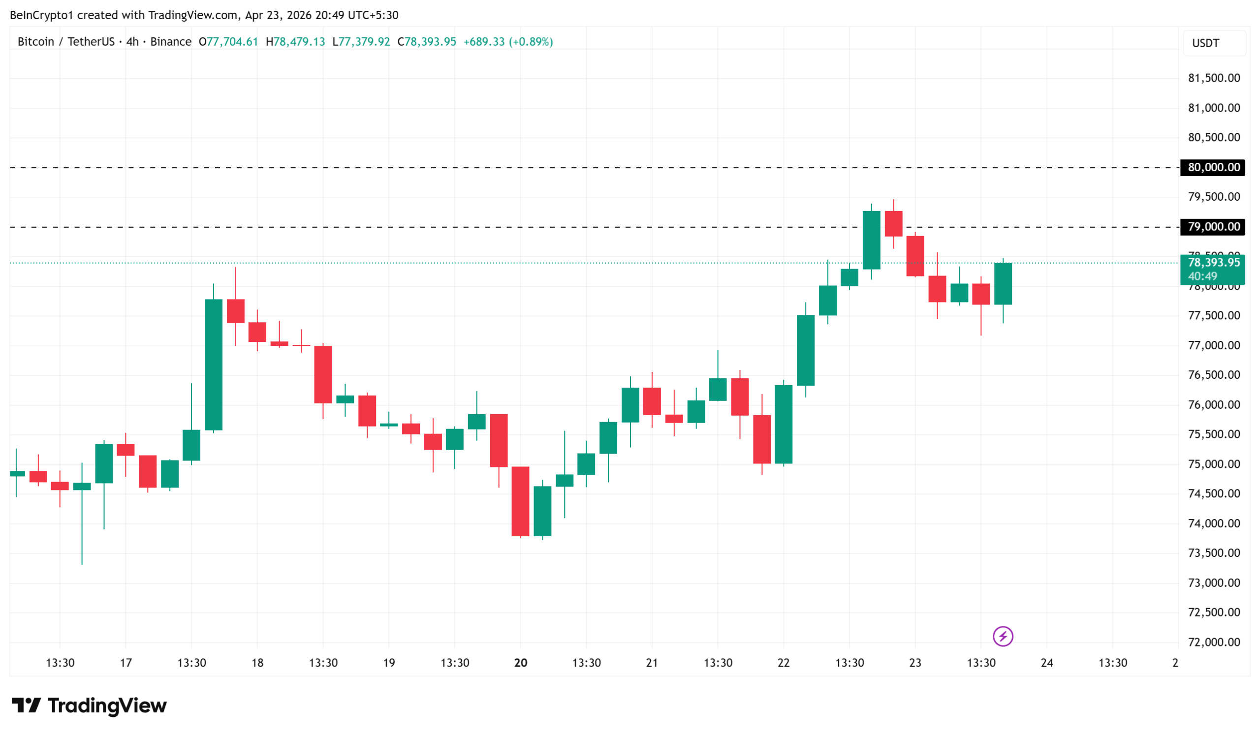 BTC opened at $78,193 on Thursday before retreating to roughly $77,465 by early morning trading. The $80,000 to $80,600 band has acted as a consistent ceiling throughout April.