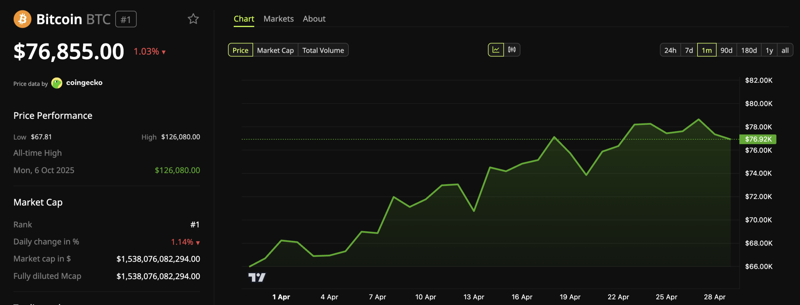 Despite these calls, Bitcoin trades roughly 39% below its October 2025 all-time high of over $126,000. The asset traded at $76,855 on April 27, with several analysts forecasting a market bottom only in late 2026.