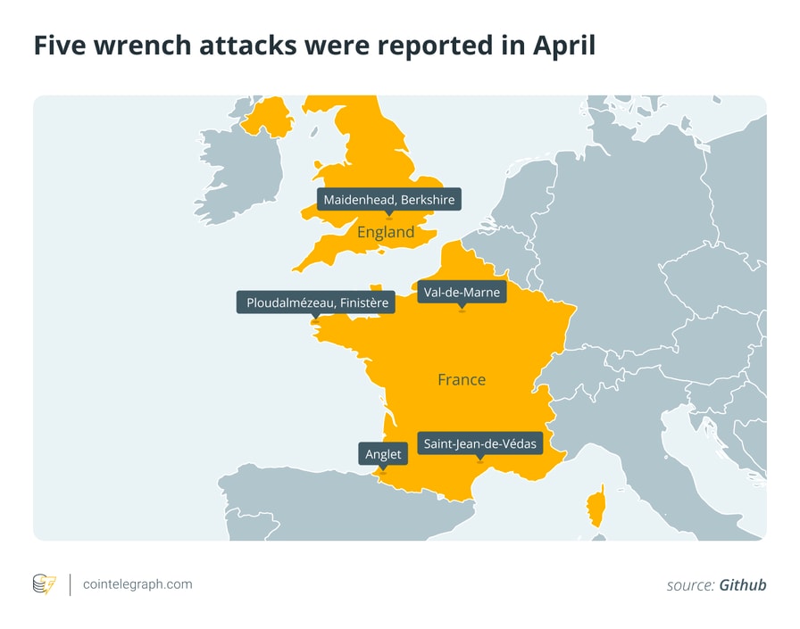 The trend of physical attacks on crypto holders continues, with five recorded incidents in April. Four happened in France, while the fifth occurred in England, according to Casa founder Jameson Lopp’s repository.