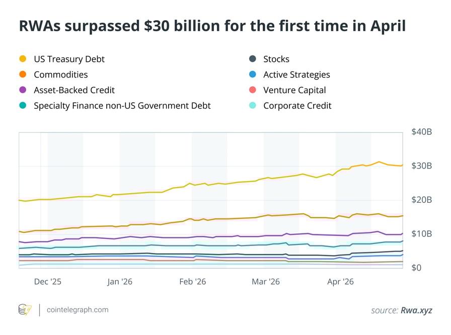 The total distributed asset value of tokenized real-world assets (RWAs) surpassed $30 billion for the first time in April.