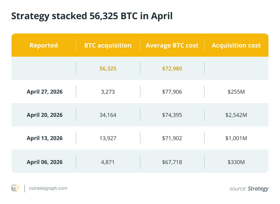 Strategy, the software company-cum-Bitcoin investment vehicle run by Michael Saylor, acquired 56,325 BTC in April.