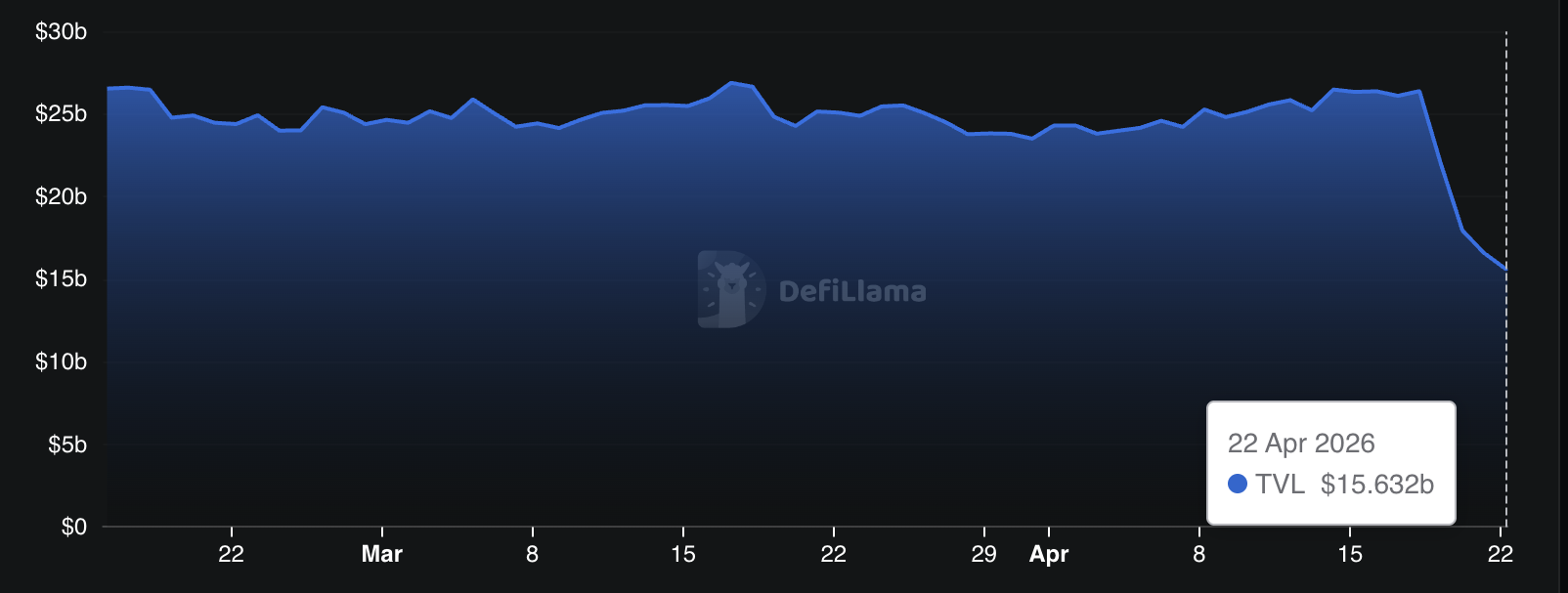 The KelpDAO incident has rattled market confidence across the Decentralized Finance (DeFi) sector. Data from DeFiLlama shows that Aave’s Total Value Locked dropped from $26.39 billion to $15.6 billion, marking a decline of over $10 billion.