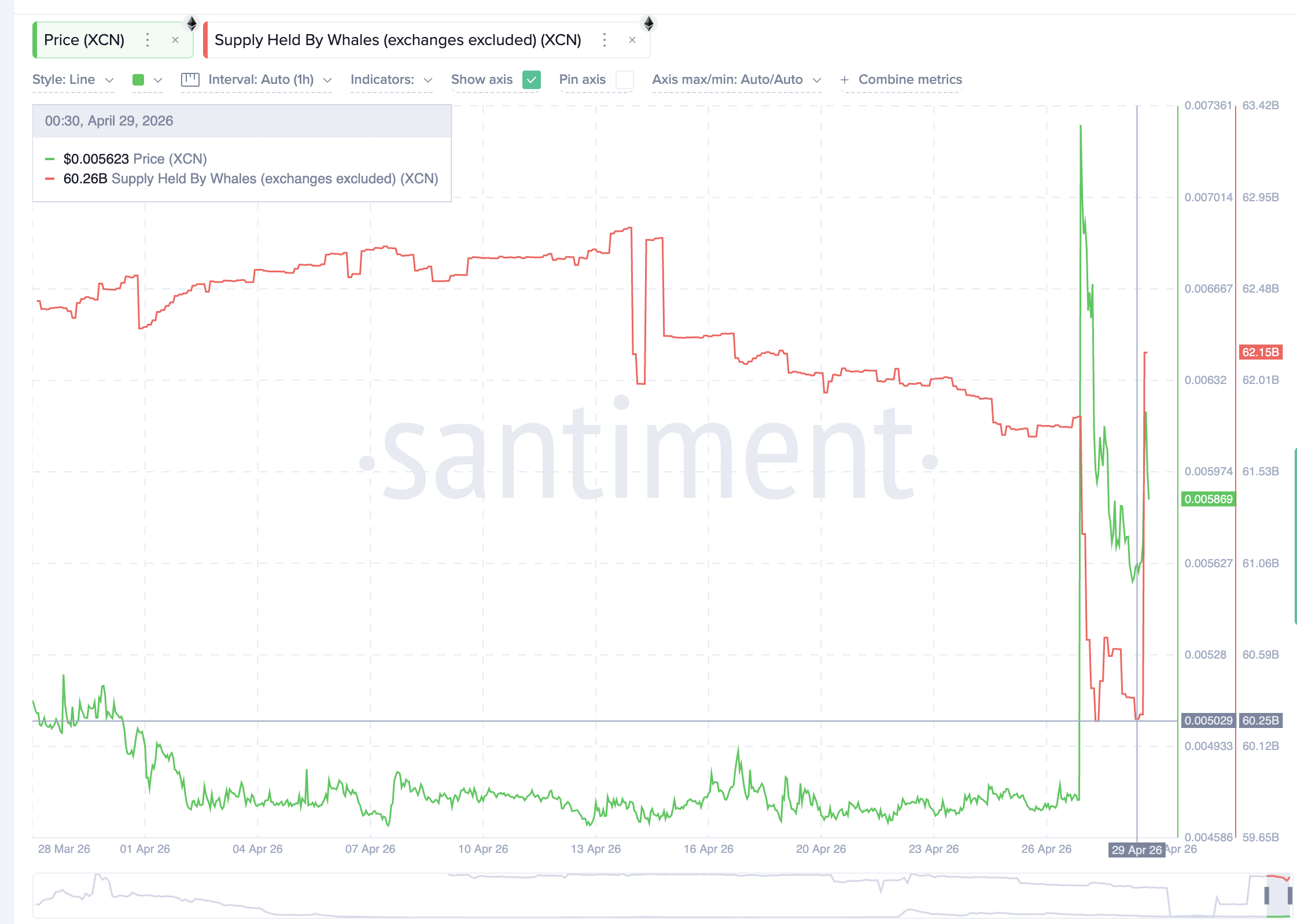 That distribution has now reversed. Whale accumulation has lifted the metric back to 62.15 billion XCN in the hours before the April 29 FOMC decision, recovering nearly 1.9 billion tokens. The timing matters because the broader crypto market is up at press time as traders rotate out of the S&P 500 ahead of Powell’s press conference. Whales appear to be positioning XCN as a beneficiary of pre-FOMC liquidity flowing into altcoins.
